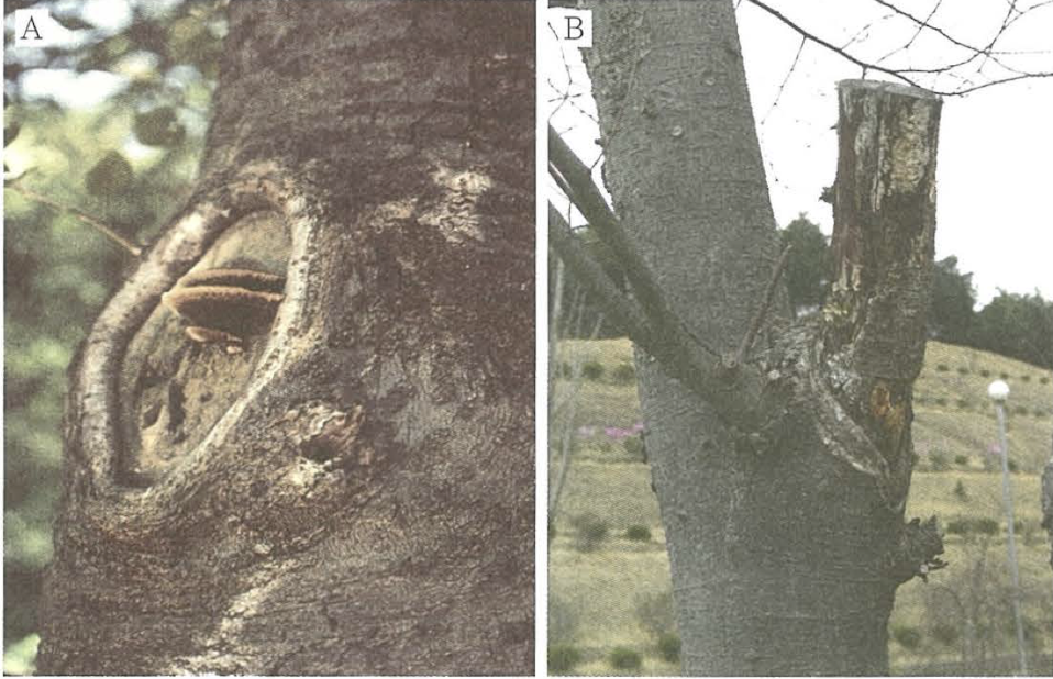 (좌) 너무 밀착 절단하여 상구가 아물지 않고, 목질부에서 버섯(목재부후균이)자라고 있음 (우) 남겨잘라서 가지터기가 썩고 상처가 아물지 못하고 있음 (출처: 신고수목병리학)