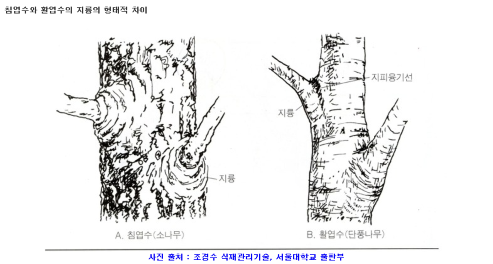 침엽수의 경우에는 바짝 제거하여 자르는데요 이것은 지피융기선과 지륭이 줄기에 근접하여 있기 때문입니다.