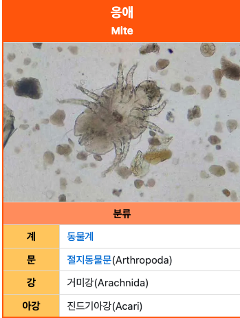 - 특징: 응애는 거미류입니다. 종류는 점박이응애, 차응애, 차먼지응애 등을 포함한 대다수의 응애들이 식물 줄기나 잎에 침을 꽂아 세포액을 빨아먹어 해를 가하지요.