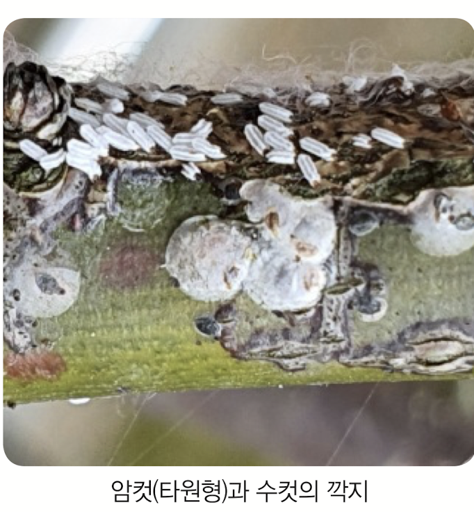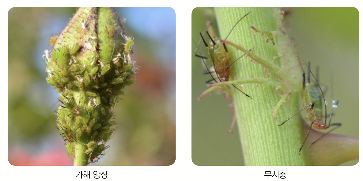 - 피해 증상: 줄기, 가지, 잎 뒷면에서 수액을 흡즙 → 조직 괴사 유발