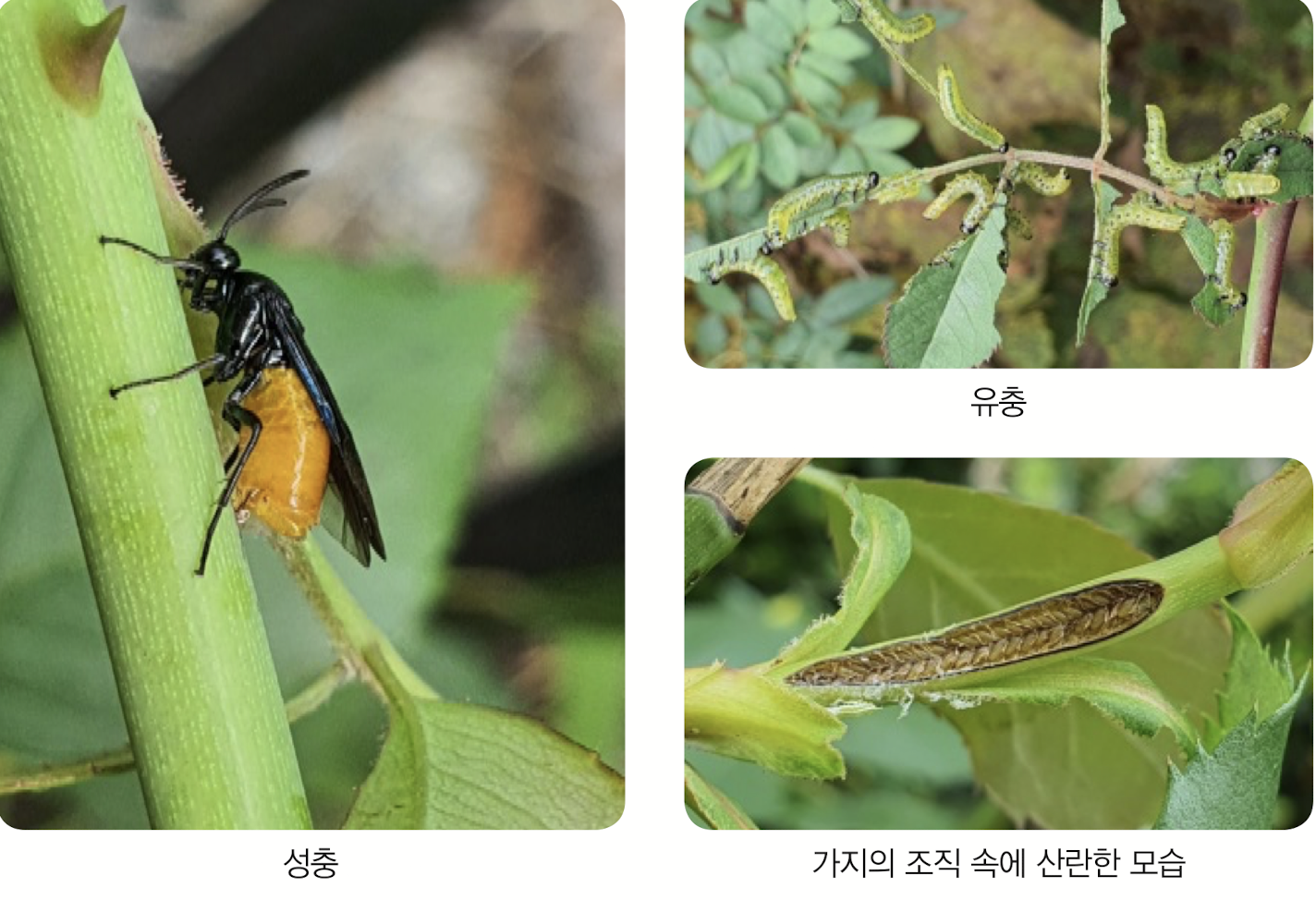 - 생활사: 연 3회 발생, 주로 5월 우화하여 어린 가지나 잎 조직 속에 산란
